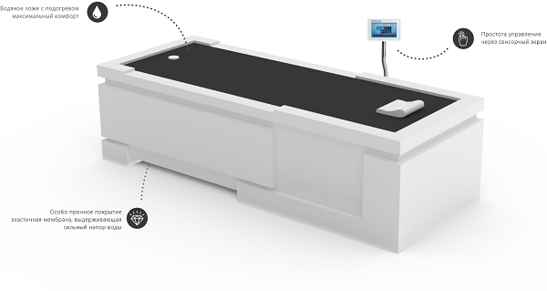 Массаж струями воды через эластичное покрытие кушетки расслабляет мышцы и избавляет от боли.